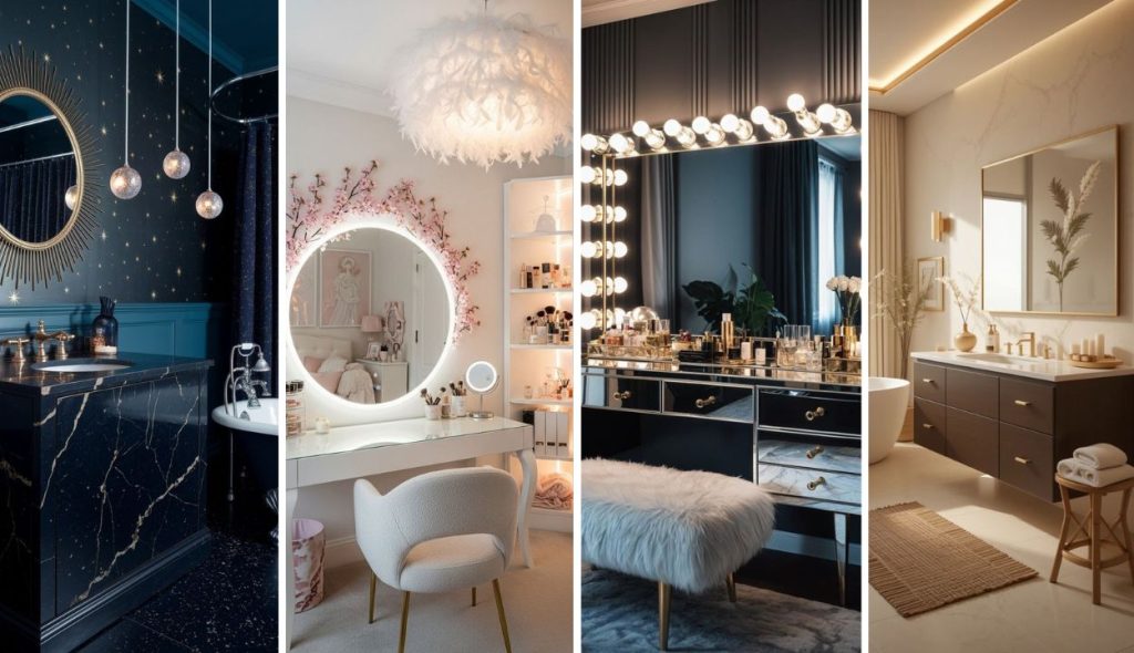 Small figurines peek from corners mysteriously. Candles flicker in unpredictable bursts. Glass jars hold secret treasures patiently. Vanity feels enchanted as storybook space.