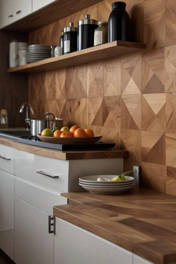 Polished wooden triangles nestle into angular labyrinths forming dynamic textured walls. Varying heights create playful shadows that crawl across kitchen surfaces unpredictably.