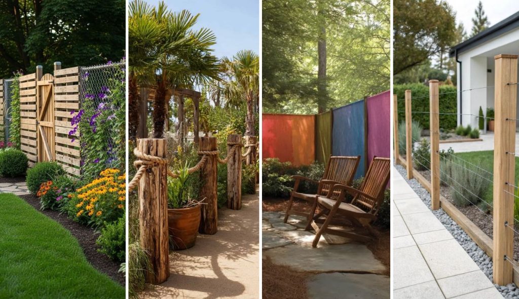 Budget stays low since materials sourced from demolition yards or thrift finds. Boundary becomes conversation piece rather than plain separation line.