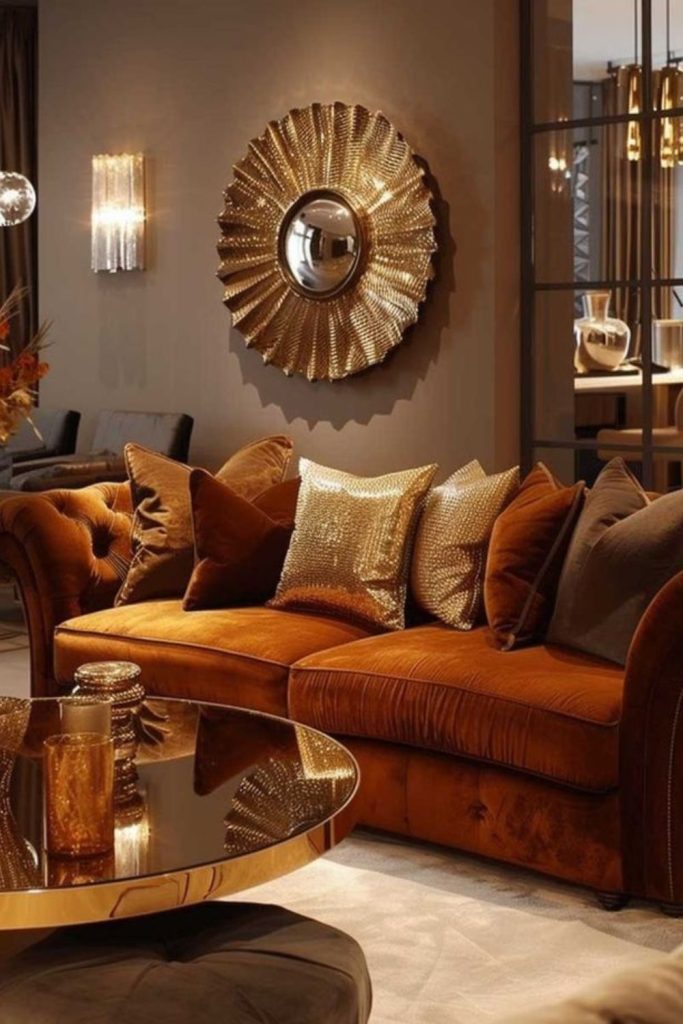 Accent pillows reflect ochre and honey in uneven bursts. Room glows with unspoken nostalgia and gentle decadence.