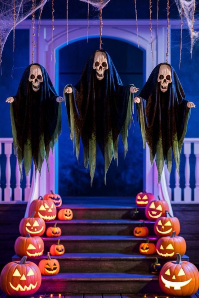 Build a giant reaper from PVC pipe frame draped with black cloth. A skull mask atop becomes its horrifying face.