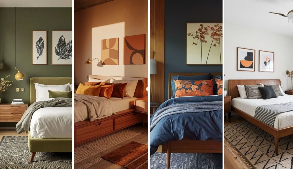 Clay hues bring warmth without heaviness. Mid century furniture grounds visual rhythm. Bedding stays neutral for balance.