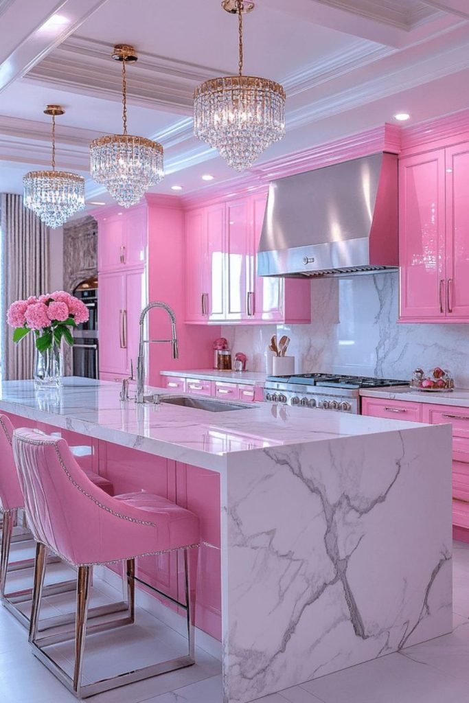 Glossy pink panels shimmer faintly catching scattered sunlight from wide windows. Countertops boast polished stone absorbing light irregularly across surfaces with subtle brilliance.
