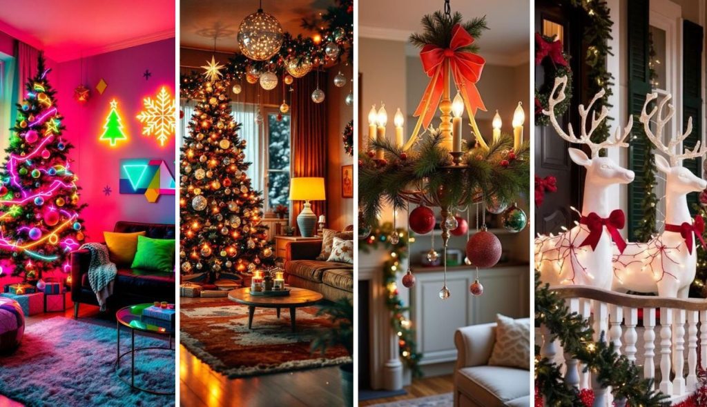 Chrome ornaments gleam beneath bubblegum-pink bulbs. Checkered ribbons snake between teal garlands. Old soda bottles filled with candy line mantels.