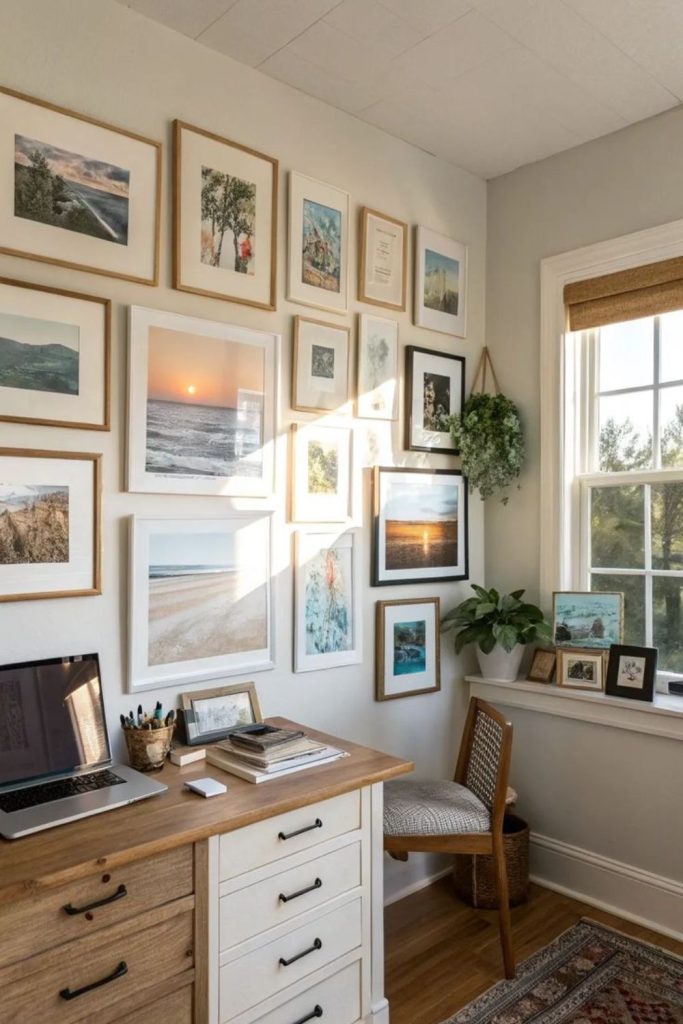 Surround workspace with framed prints photos or paintings. Creativity thrives when walls showcase inspiration constantly. Slim desk placed below completes artistic cocoon.