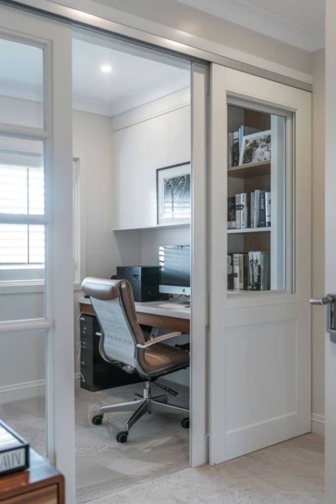 Glass or wooden sliders split living quarters into focused chambers. A small desk fits within this boundary preserving separation. Slide doors closed during projects then open afterward.
