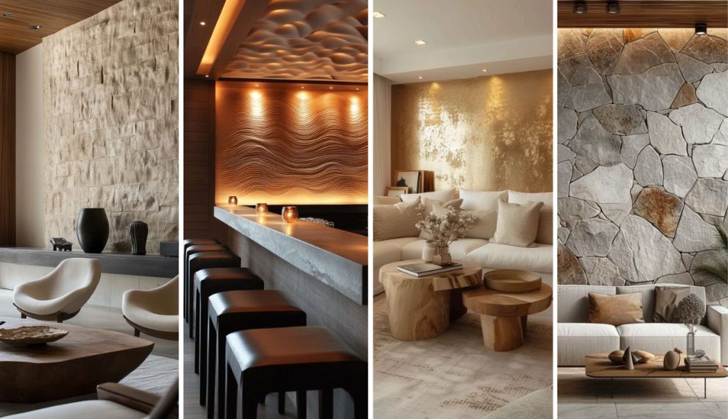 Lighting enhances depth of veins irregularly without predictability. Furniture integrates naturally blending rugged mineral tones with soft upholstery.