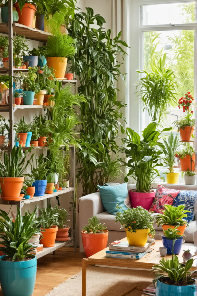 Choose a variety of plants suited for indoor environments, like peace lilies or spider plants. Select pots in a range of vibrant colors that complement your decor.