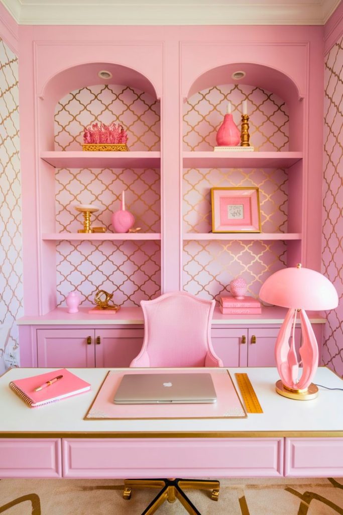 A pink desk and chair create a cohesive look, while subtle decor such as vases add personality.