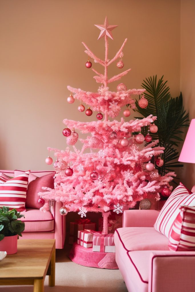 Placing the tree in a cozy living space with matching pink furniture and striped cushions creates a harmonious, inviting ambiance.