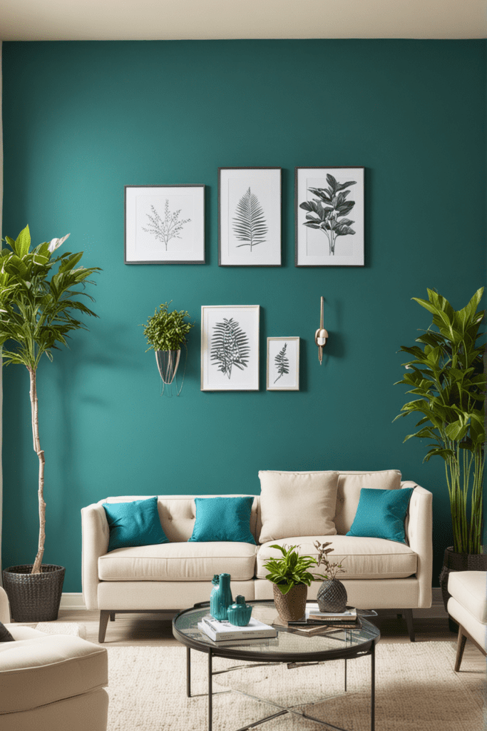 A teal accent wall is an excellent way to enhance your living room’s character and charm. Adding a bold color like teal to one wall instantly draws attention without dominating the space.